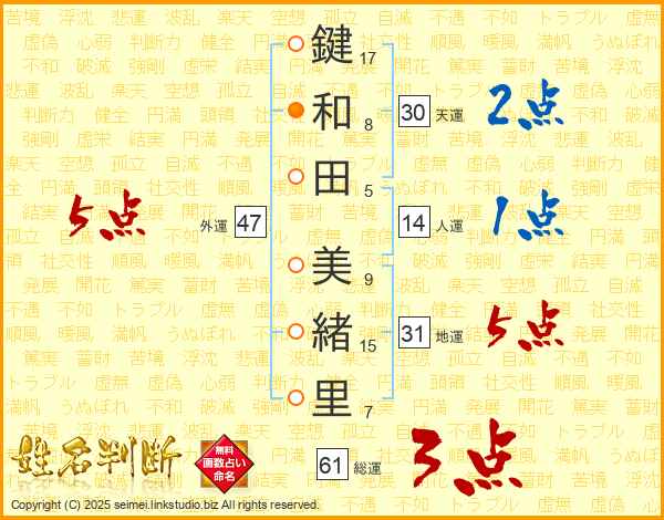 鍵和田美緒里さんの地運は31画の5点!
