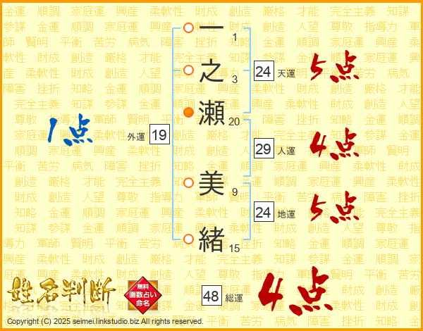 一(1画)之(3画)瀬(20画) 美(9画)緒(15画)