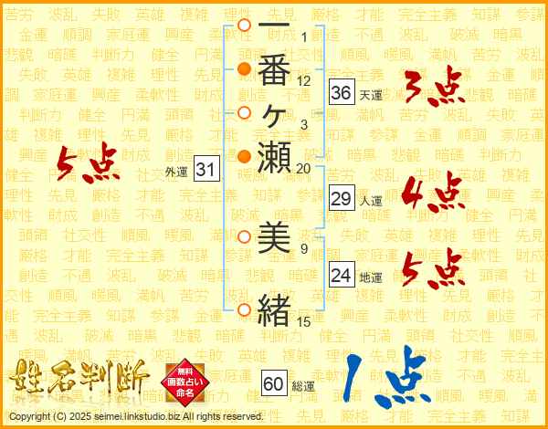 一番ヶ瀬美緒さんの総運は60画の1点!