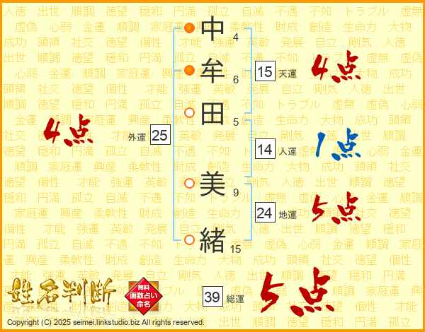中(4画)牟(6画)田(5画) 美(9画)緒(15画)
