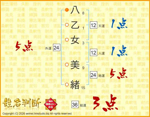 八(8画)乙(1画)女(3画) 美(9画)緒(15画)