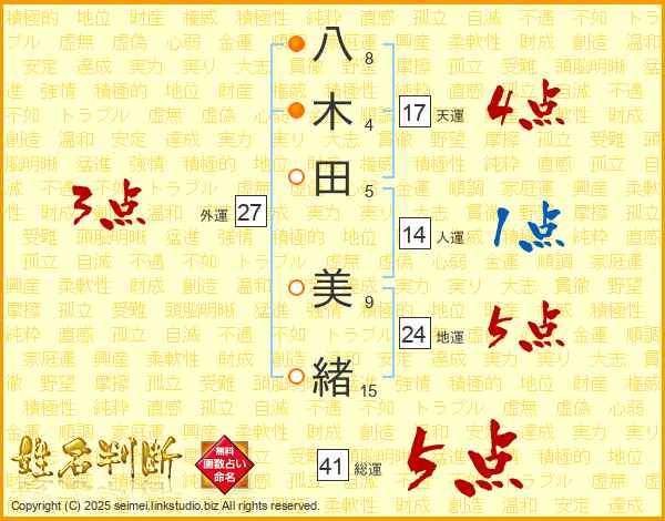 八(8画)木(4画)田(5画) 美(9画)緒(15画)
