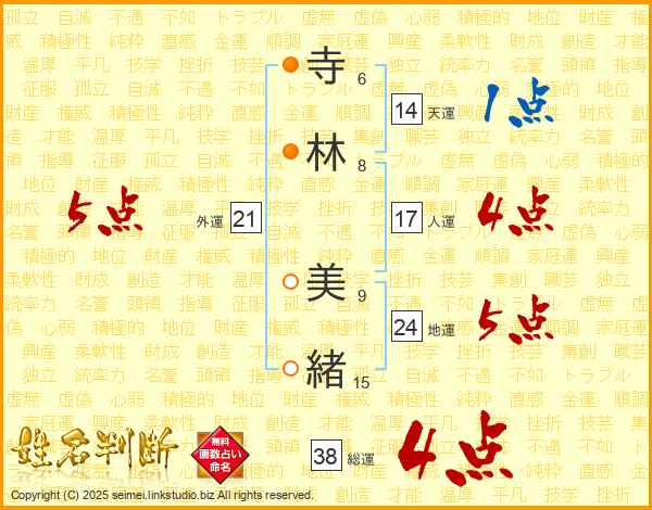 生活面を象徴する運勢です。外部から受ける影響力を表し、結婚運、家庭運や職場、環境への順応性を表します。総運から人運を引いた画数。姓や名が1文字の場合を除く。