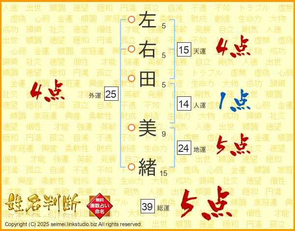 左(5画)右(5画)田(5画) 美(9画)緒(15画)