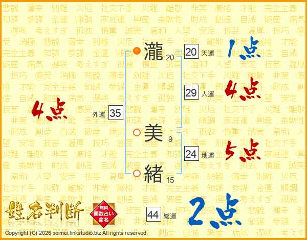 家系が持つ宿命的な運勢を表します。祖先から受け継いだ苗字ですので自分の力が及びません。家柄を象徴します。苗字の合計画数。
