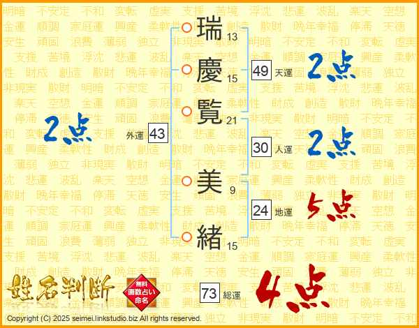 瑞(13画)慶(15画)覧(21画) 美(9画)緒(15画)