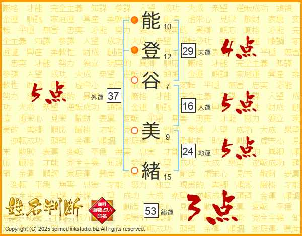 能(10画)登(12画)谷(7画) 美(9画)緒(15画)