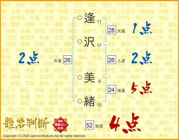 逢(11画)沢(17画) 美(9画)緒(15画)