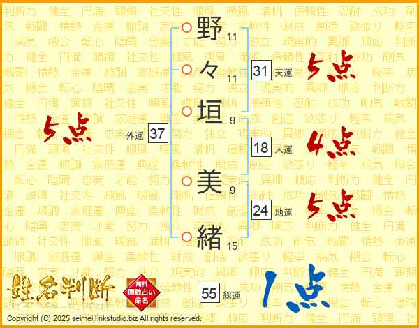 野(11画)々(11画)垣(9画) 美(9画)緒(15画)