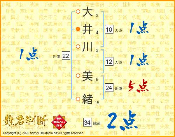 大(3画)井(4画)川(3画)  美(9画)緒(15画)