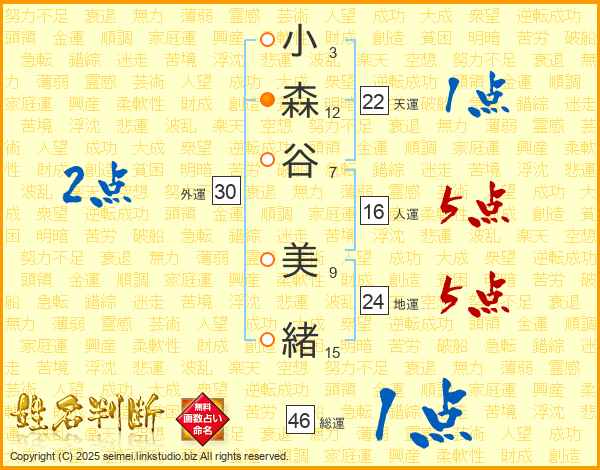 小(3画)森(12画)谷(7画)  美(9画)緒(15画)