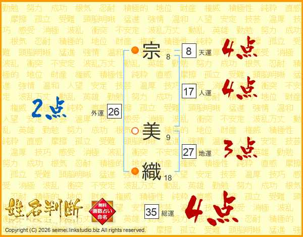 宗(8画) 美(9画)織(18画)