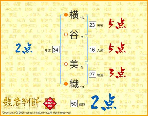 横(16画)谷(7画) 美(9画)織(18画)