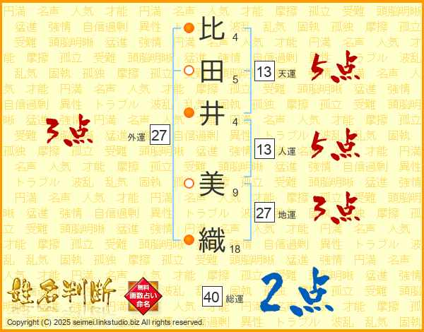 比(4画)田(5画)井(4画) 美(9画)織(18画)