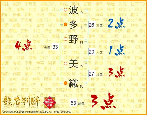波(9画)多(6画)野(11画) 美(9画)織(18画)