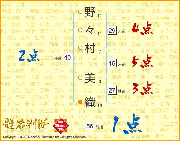 野(11画)々(11画)村(7画) 美(9画)織(18画)