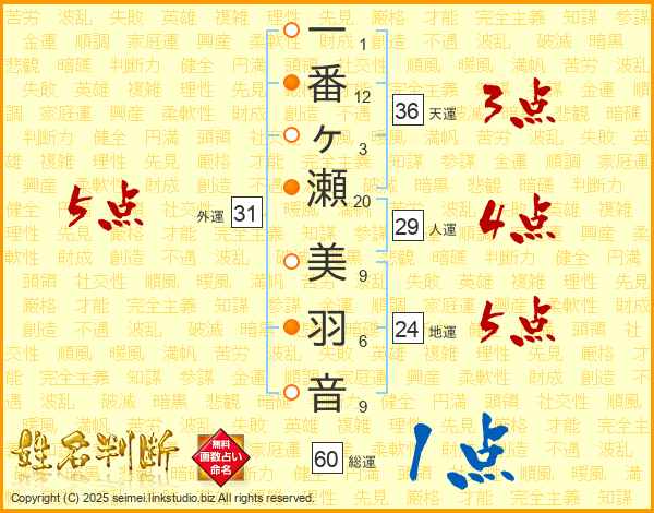 一番ヶ瀬美羽音さんの総運は60画の1点!