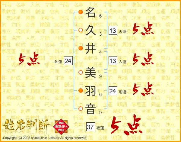 名(6画)久(3画)井(4画) 美(9画)羽(6画)音(9画)