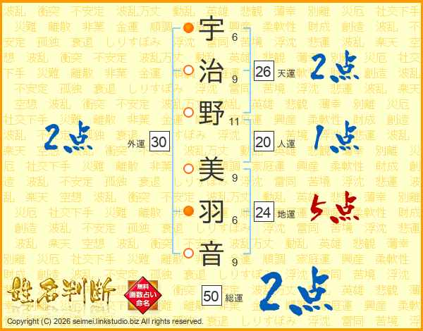 宇(6画)治(9画)野(11画) 美(9画)羽(6画)音(9画)