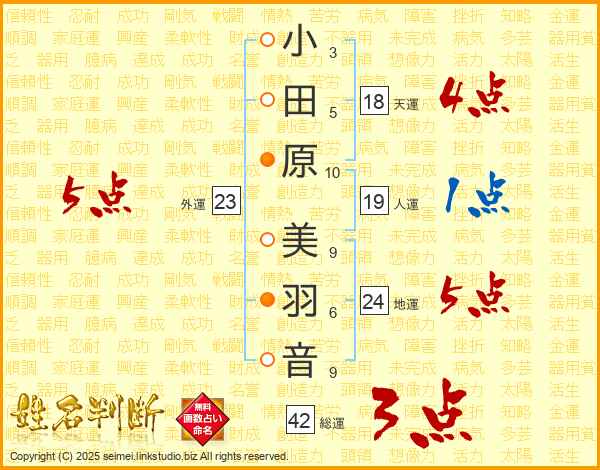小(3画)田(5画)原(10画) 美(9画)羽(6画)音(9画)