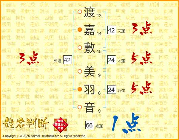渡(13画)嘉(14画)敷(15画) 美(9画)羽(6画)音(9画)