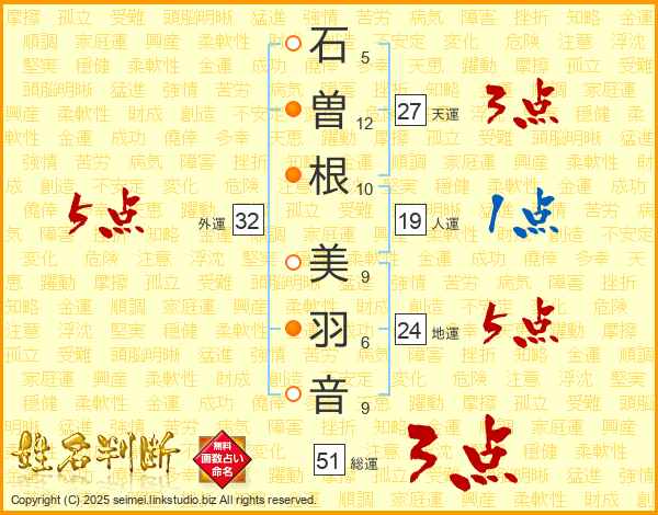 石(5画)曽(12画)根(10画) 美(9画)羽(6画)音(9画)