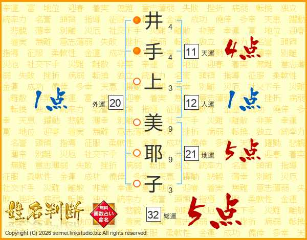井(4画)手(4画)上(3画) 美(9画)耶(9画)子(3画)