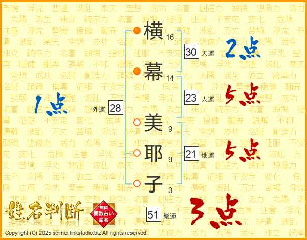 横(16画)幕(14画) 美(9画)耶(9画)子(3画)