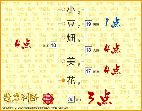小(3画)豆(7画)畑(9画) 美(9画)花(8画)