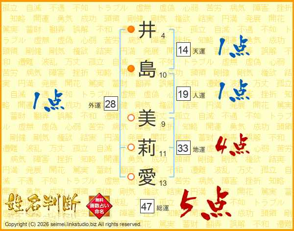 井(4画)島(10画) 美(9画)莉(11画)愛(13画)