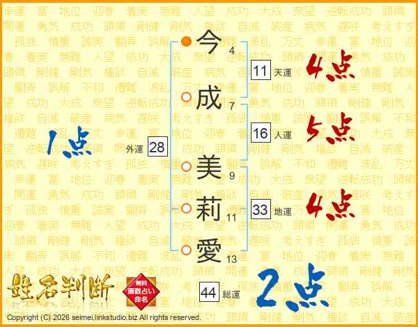 今(4画)成(7画) 美(9画)莉(11画)愛(13画)
