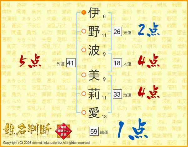 伊(6画)野(11画)波(9画) 美(9画)莉(11画)愛(13画)