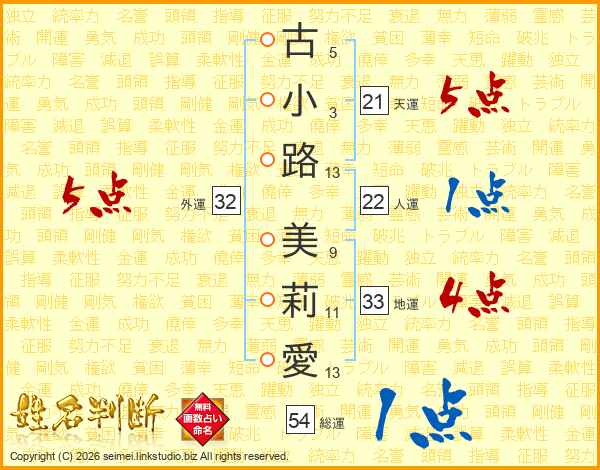 古(5画)小(3画)路(13画) 美(9画)莉(11画)愛(13画)