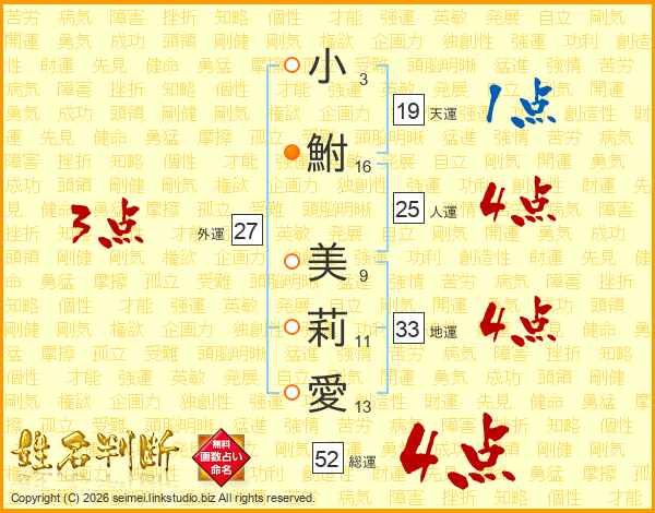小鮒美莉愛さんの総運は52画の4点!