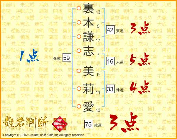 裏(13画)本(5画)謙(17画)志(7画) 美(9画)莉(11画)愛(13画)