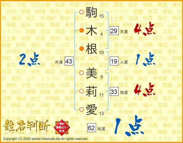 駒(15画)木(4画)根(10画) 美(9画)莉(11画)愛(13画)