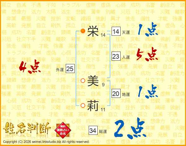 栄(14画) 美(9画)莉(11画)