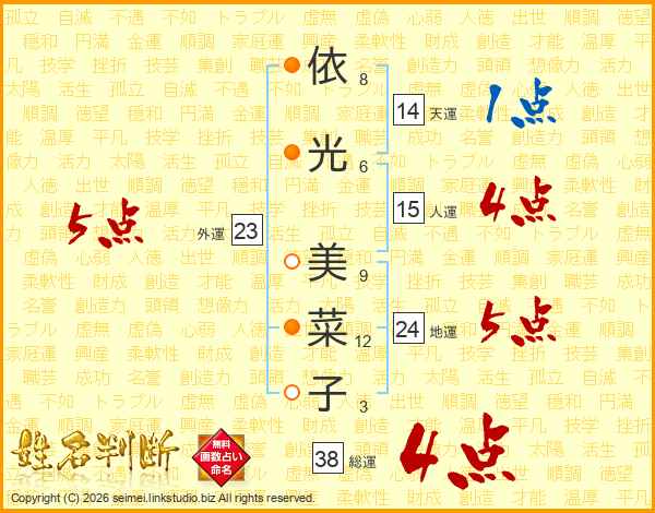 依(8画)光(6画) 美(9画)菜(12画)子(3画)