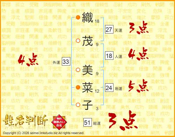 織(18画)茂(9画) 美(9画)菜(12画)子(3画)