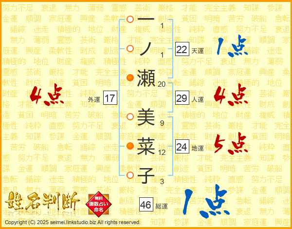 一(1画)ノ(1画)瀬(20画) 美(9画)菜(12画)子(3画)