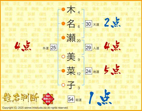 木(4画)名(6画)瀬(20画) 美(9画)菜(12画)子(3画)