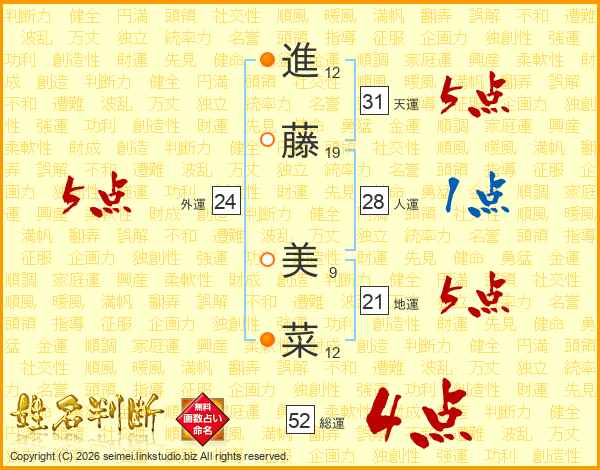 進(12画)藤(19画) 美(9画)菜(12画)