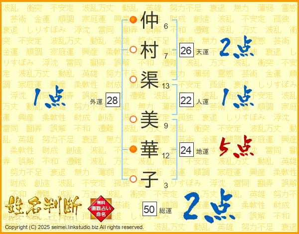 仲(6画)村(7画)渠(13画) 美(9画)華(12画)子(3画)