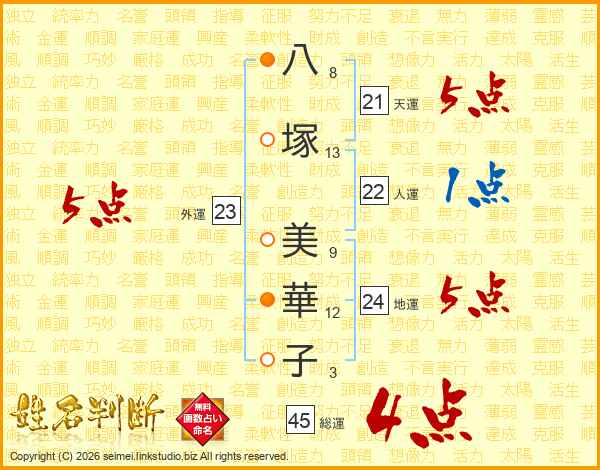 八(8画)塚(13画) 美(9画)華(12画)子(3画)