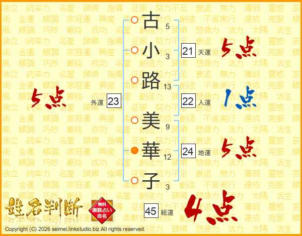 古(5画)小(3画)路(13画) 美(9画)華(12画)子(3画)