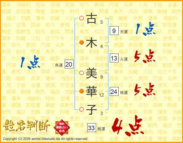 古(5画)木(4画) 美(9画)華(12画)子(3画)