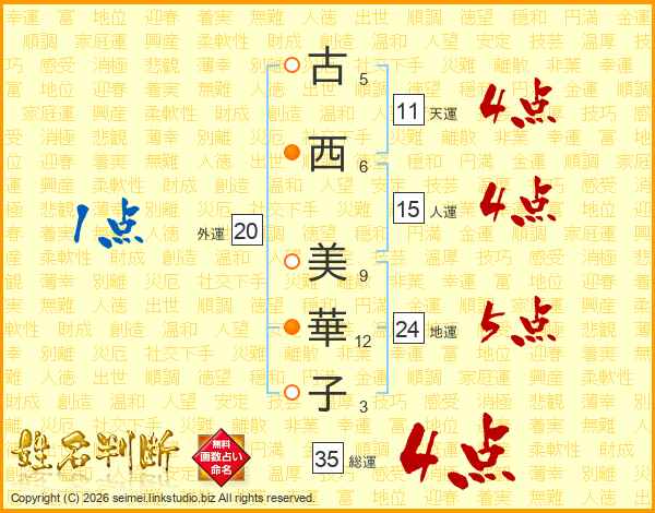 古(5画)西(6画) 美(9画)華(12画)子(3画)