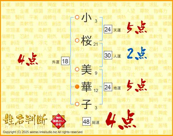 小(3画)桜(21画) 美(9画)華(12画)子(3画)