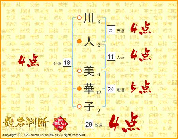 川(3画)人(2画) 美(9画)華(12画)子(3画)