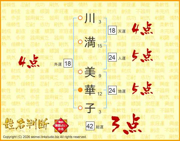 川(3画)満(15画) 美(9画)華(12画)子(3画)